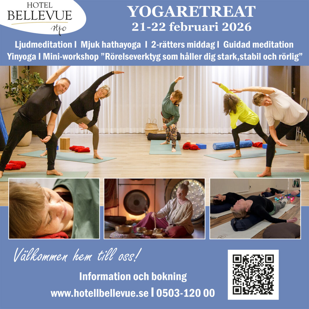 Den 21-22 februari är du välkommen att delta i en yogaretreat i yoga- och träningsstudion Djupet på Hotell Bellevue. Njut av rofyllda, avspännande och hållningsförbättrande yogapass, magiska meditationer som får kroppen att sjunka in i djup vila och sinnet att mjukt stillna – och mat tillagad med omsorg. Lär dig mer om hur du kan träna med lite extra omtanke om dig själv och ge kroppen och sinnet en rejäl chans till återhämtning. En perfekt paus från vardagen där du får landa i dig själv, andas ut och hitta in i ett inre lugn.